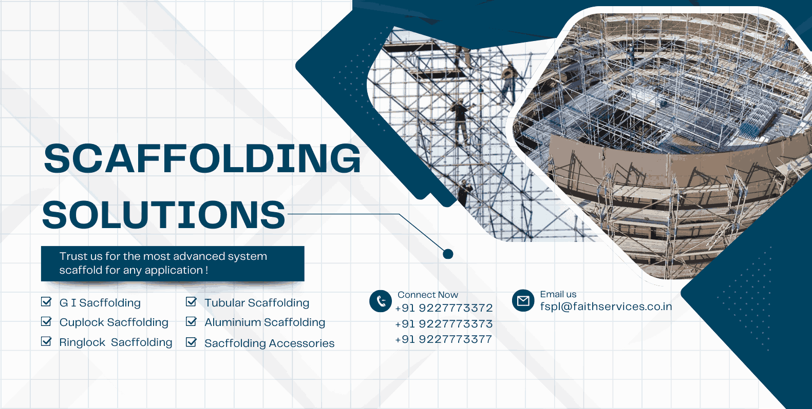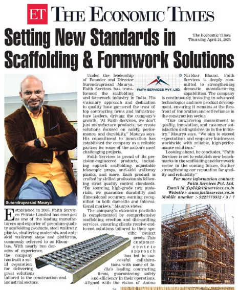 Faith Services Pvt. Ltd. specializes in the manufacturing, exporting, and rental of world-class scaffolding, formwork, and steel products. We provide comprehensive solutions including scaffolding systems, steel walkway planks, pre-engineered buildings, and portable cabins.