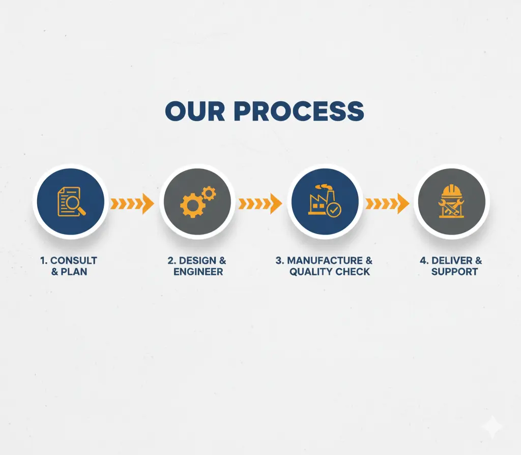 Consultation, Planning & Design We start with a detailed consultation to understand your project needs. Our expert team then develops a customized plan, including 2D/3D visualizations and a clear scope of work, ensuring all requirements are integrated before manufacturing begins.